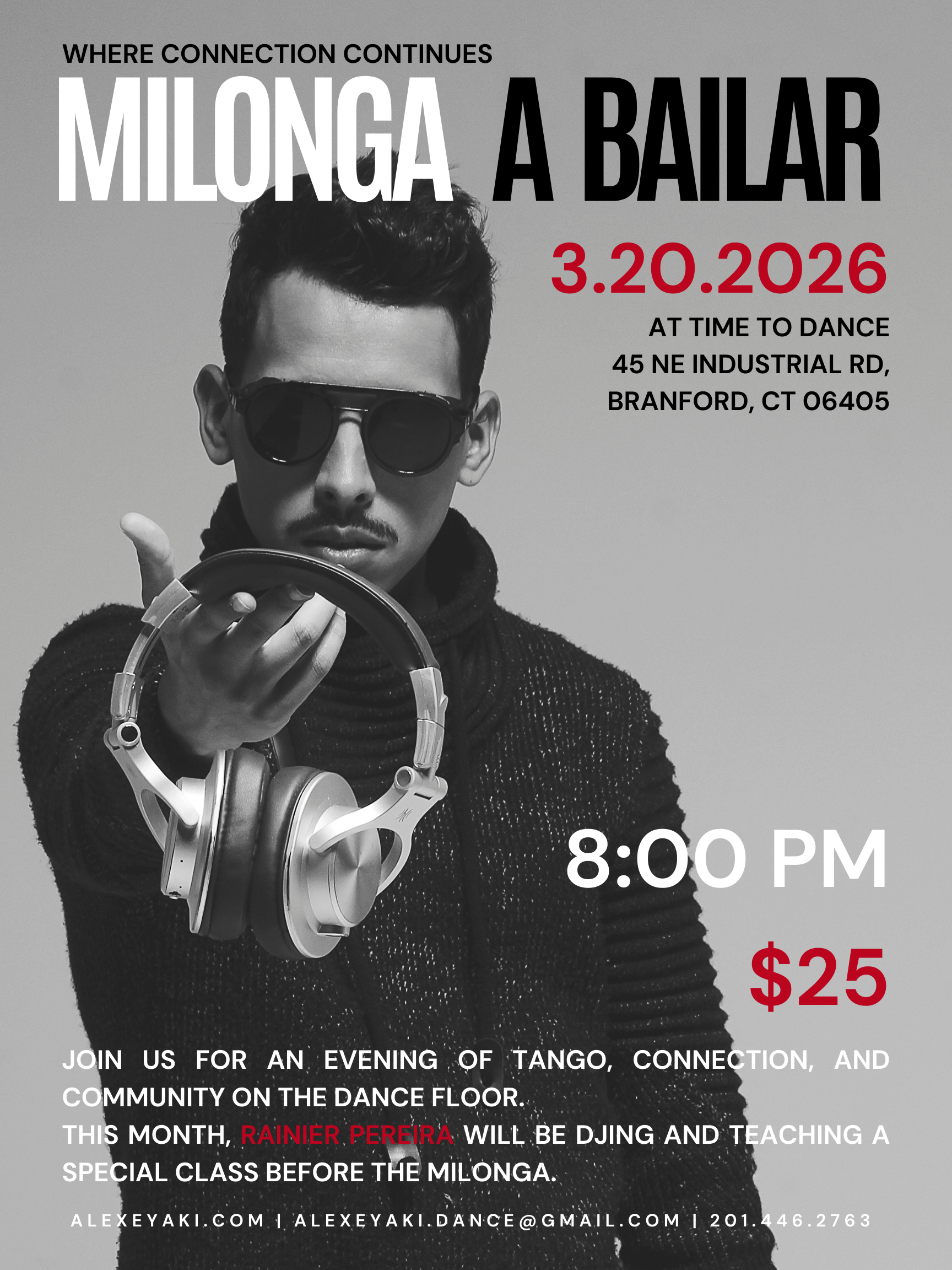This month we are happy to welcome Rainier Pereira, who will be DJing the milonga and teaching a special class beforehand.